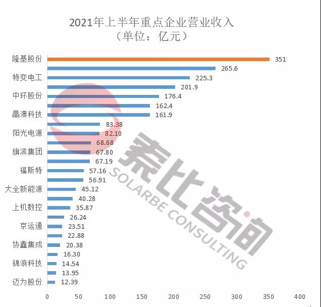 從營收來看,2021年上半年104家企業(yè)總營收3712億元,同比增長146%。光伏龍頭企業(yè)隆基股份以351億元的營業(yè)收入位居榜首,遙遙領(lǐng)先;通威股份、特變電工、天合光能、中環(huán)股份位居前五。