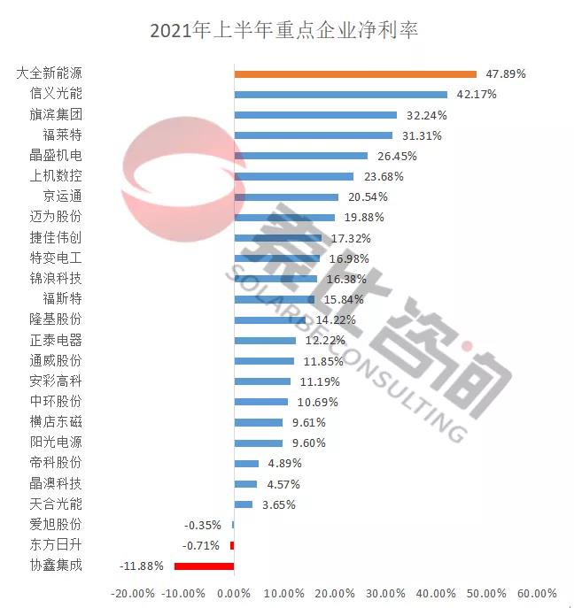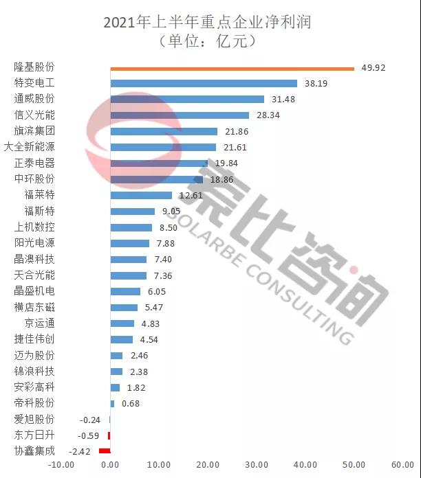 從凈利潤來看,2021年上半年104家企業(yè)凈利潤合計(jì)450.58億元,同比增長61.72%。光伏龍頭企業(yè)隆基股份以凈利潤49.92億元,位居榜首;特變電工以38.19億元,位居第二。