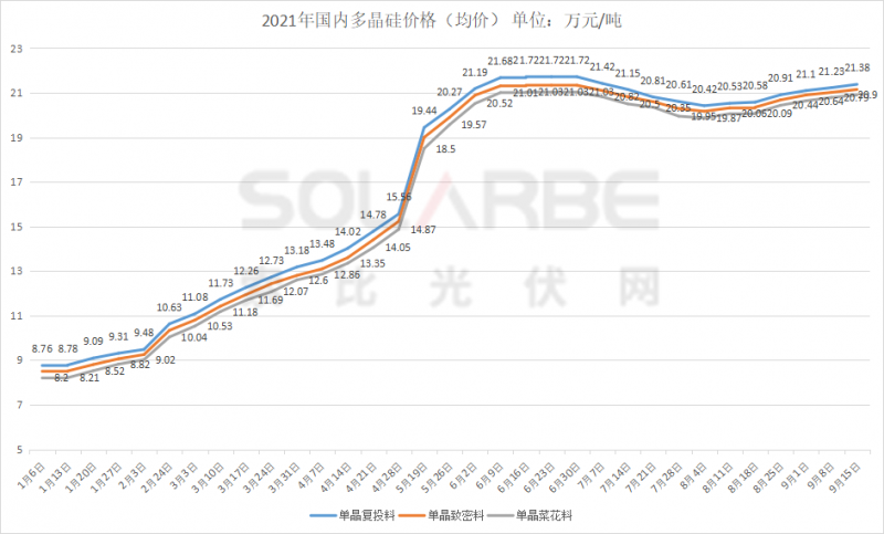 9月15日,硅業(yè)分會(huì)發(fā)布了本周國(guó)內(nèi)多晶硅成交價(jià)。其中單晶復(fù)投料價(jià)格區(qū)間在20.6-21.9萬(wàn)元/噸,成交均價(jià)小幅上漲至21.38萬(wàn)元/噸,周環(huán)比漲幅為0.71%;單晶致密料價(jià)格區(qū)間在20.4-21.7萬(wàn)元/噸,成交均價(jià)上漲至21.15萬(wàn)元/噸,周環(huán)比漲幅為0.62%。