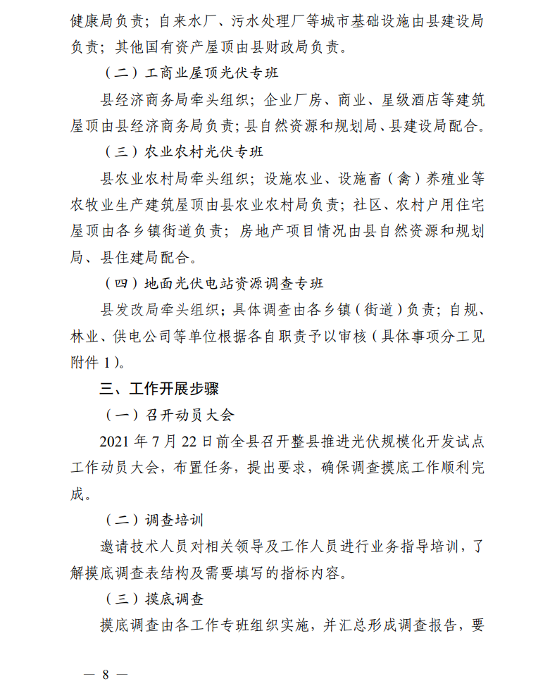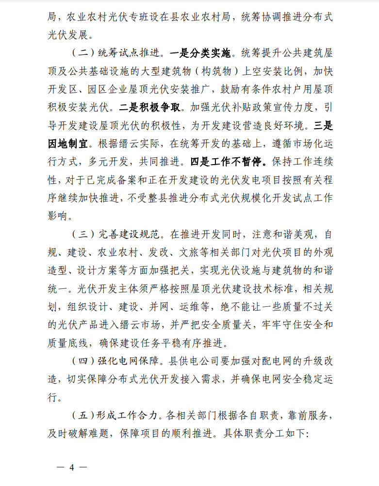 四是工作不暫停。保持工作連續(xù)性,對于已完成備案和正在開發(fā)建設(shè)的光伏發(fā)電項(xiàng)目按照有關(guān)程序繼續(xù)加快推進(jìn),不受整縣推進(jìn)分布式光伏規(guī)模化開發(fā)試點(diǎn)工作影響。