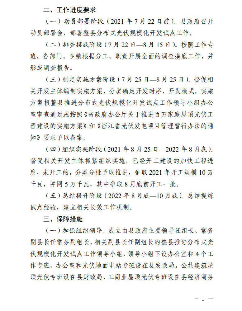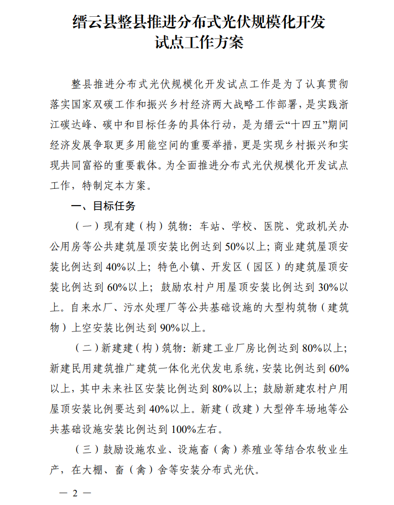 日前,縉云縣人民政府辦公室發(fā)布關(guān)于印發(fā)《縉云縣整縣推進(jìn)分布式光伏規(guī)?;_發(fā)試點(diǎn)工作方案》《縉云縣分布式光伏資源調(diào)查摸底工作方案》的通知。通知明確,縉云縣整縣推進(jìn)分布式光伏規(guī)模化開發(fā)試點(diǎn)工作目標(biāo)任務(wù)為:
