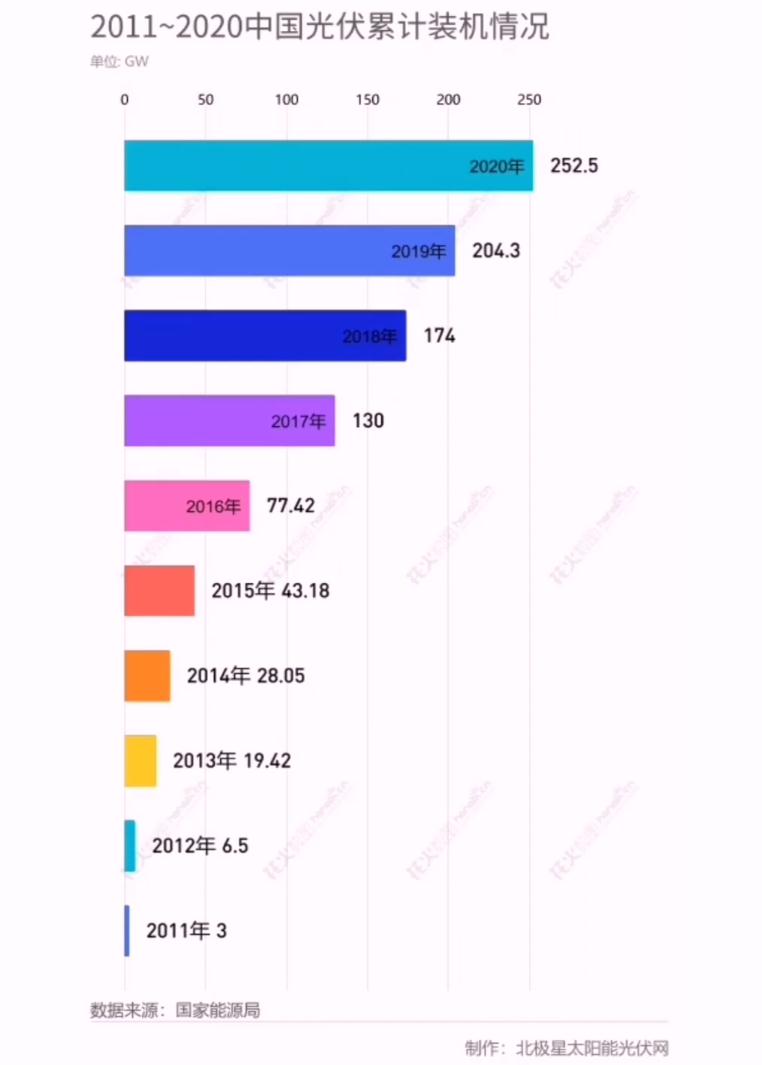 從2011年至2020年,中國(guó)光伏累計(jì)裝機(jī)從3GW增長(zhǎng)至252.5GW,根據(jù)國(guó)家能源局?jǐn)?shù)據(jù),截至2021年6月30日,中國(guó)光伏累計(jì)裝機(jī)已達(dá)267GW,十年飆漲880%。