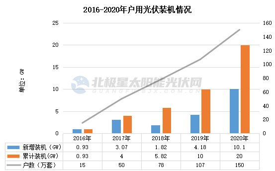 根據(jù)國家能源局公布的數(shù)據(jù),2019年戶用光伏實(shí)際新增裝機(jī)達(dá)到4.18GW。占全國裝機(jī)17.6%,成為2019年新增裝機(jī)中的亮點(diǎn)。2020年戶用光伏表現(xiàn)的更為“搶眼”,新增裝機(jī)規(guī)模達(dá)到了10.1GW,占總裝機(jī)的21%,占分布式光伏的67%。