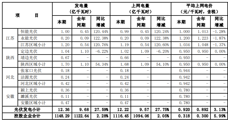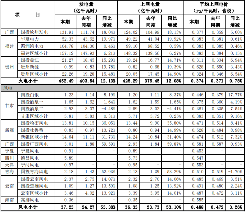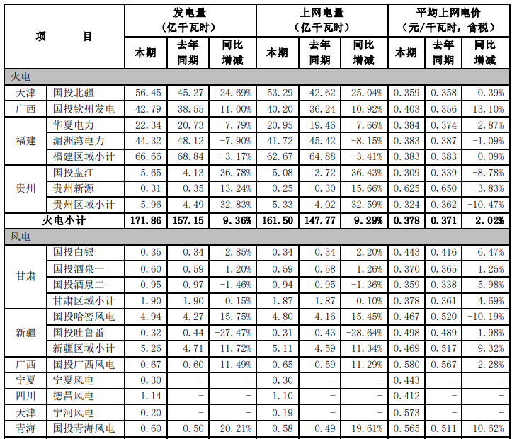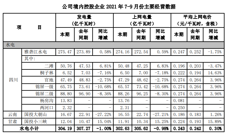 根據(jù)國投電力控股股份有限公司(以下簡稱公司)境內(nèi)控股企業(yè)初步統(tǒng)計(jì), 2021年 7-9 月,公司境內(nèi)控股企業(yè)累計(jì)完成發(fā)電量491.30 億千瓦時(shí),上網(wǎng)電量479.04 億千瓦時(shí),與去年同期相比分別增加3.15%和3.02%。2021年1-9月,公司境內(nèi)控股企業(yè)累計(jì)完成發(fā)電量1148.29億千瓦時(shí),上網(wǎng)電量1116.45億千瓦時(shí), 與去年同期相比分別增加 2.28%和2.05%。 2021年7-9 月,公司境內(nèi)控股企業(yè)平均上網(wǎng)電價(jià)0.299 元/千瓦時(shí),與去年同期相比增加了 2.04%。