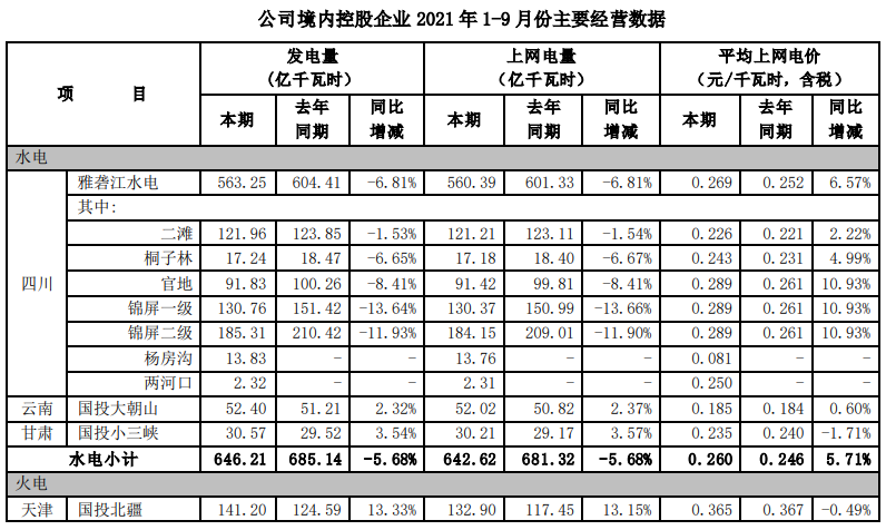 2021年1-9月,公司境內(nèi)控股企業(yè)平均上網(wǎng)電價(jià) 0.318元/ 千瓦時(shí),與去年同期相比增加了5.99%。