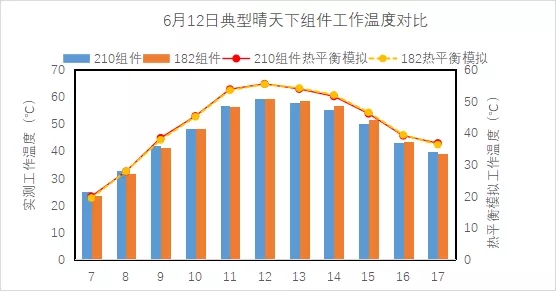 任選典型晴天下,組件工作溫度實測與模擬結(jié)果均顯示,210組件并無高工作溫度風(fēng)險,且早晚低輻照時段,210組件溫度略有優(yōu)勢: