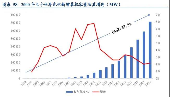2014 年之后,光伏發(fā)電行業(yè)經(jīng)過(guò)優(yōu)勝劣汰的篩選,發(fā)電成本持續(xù)大幅下降,投資回報(bào)重 新獲得平衡,全球更多的國(guó)家加入到支持光伏發(fā)電的行列,具有技術(shù)研發(fā)優(yōu)勢(shì)、規(guī)模優(yōu)勢(shì)的企業(yè)涌現(xiàn)??v觀歷史,近20年間光伏增速年均復(fù)合增長(zhǎng)率達(dá) 37.5%。