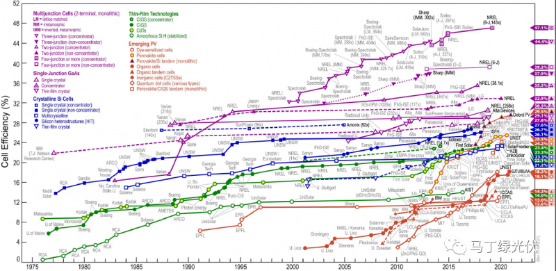 由鈣鈦礦電池和晶體硅組成的疊層電池理論轉(zhuǎn)換率極限可達(dá)43%。