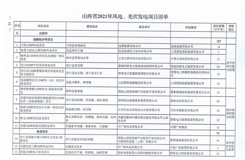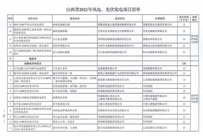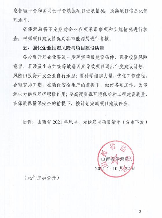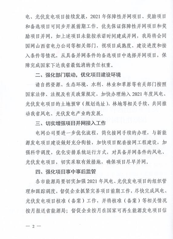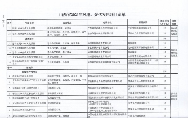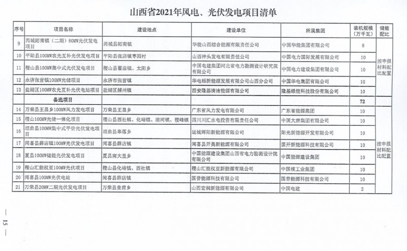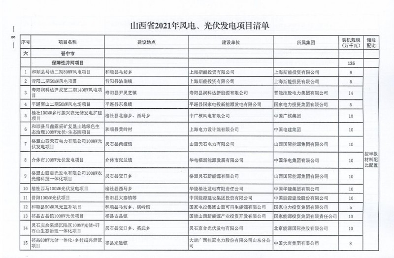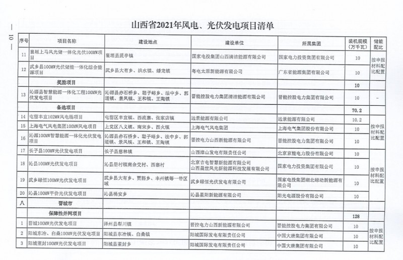 10月22日,山西省能源局下達(dá)2021年度風(fēng)電、光伏發(fā)電保障性并網(wǎng)年度建設(shè)計(jì)劃。風(fēng)、光合計(jì)17.792GW,其中保障性11.2GW+獎(jiǎng)勵(lì)700MW+備選5.892GW。文件明確保障性規(guī)模與獎(jiǎng)勵(lì)規(guī)模可同步開展前期工作,優(yōu)先保證保障性并網(wǎng)項(xiàng)目和獎(jiǎng)勵(lì)項(xiàng)目并網(wǎng),如上述項(xiàng)目未能按承諾時(shí)間并網(wǎng),將視項(xiàng)目成熟度、建設(shè)進(jìn)度和接入條件等,從備選項(xiàng)目中選擇并網(wǎng)項(xiàng)目,保障完成國(guó)家下達(dá)的最低消納責(zé)任權(quán)重。