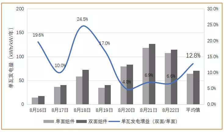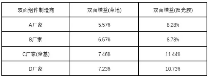假設(shè)系統(tǒng)成本3.5元/W,在相同回收期的前提下,這部分多發(fā)電的價值可折算為3.5元/W*1.3%=0.45元/W,也即雙面組件可實現(xiàn)4.5分/W的溢價。