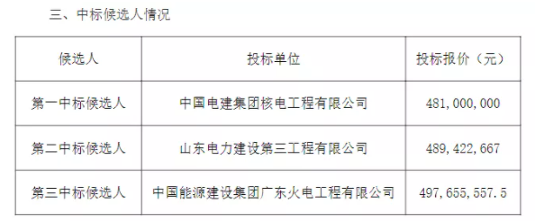 第一中標(biāo)候選人:中國電建集團核電工程有限公司,投標(biāo)含稅總報價∶19762.307 萬元,折合3.85元/W。