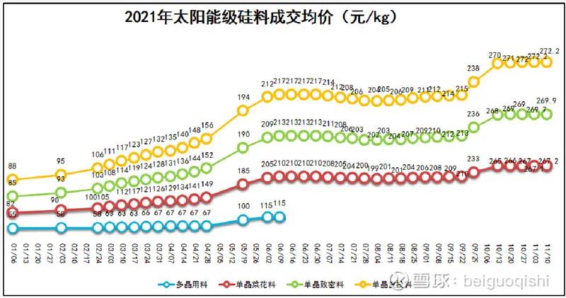 光伏原材料多晶硅價格從年初的88元/kg(復(fù)投料),一路上漲至本周的272元/kg,上漲幅度之大超出了大多數(shù)人的預(yù)期。最近一個多月一直在272元/kg左右徘徊。