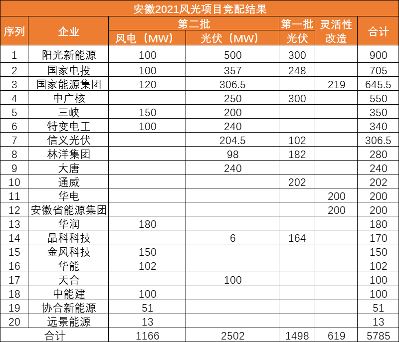 此前10月21日,安徽省能源局下發(fā)《2021年光伏發(fā)電項(xiàng)目并網(wǎng)規(guī)模競(jìng)爭(zhēng)性配置(第一批次)中選公告》,規(guī)模共計(jì)1498MW。中廣核、陽光新能源、國(guó)家電投、通威、林洋、晶科、信義光能等7家企業(yè)中標(biāo)20個(gè)光伏第一批優(yōu)選項(xiàng)目。加上此次安徽省總共公示了4GW光伏、1.166GW風(fēng)電項(xiàng)目。