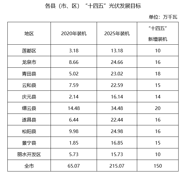 全面貫徹黨的十九大和十九屆二中、三中、四中、五中全會(huì)精神,認(rèn)真落實(shí)國家和省碳達(dá)峰碳中和工作部署,牢牢把握生態(tài)文明建設(shè)要求,加強(qiáng)統(tǒng)籌協(xié)調(diào),創(chuàng)新發(fā)展模式,加快調(diào)整優(yōu)化能源結(jié)構(gòu),以分布式光伏整縣(市、區(qū))規(guī)?;_發(fā)為抓手,全面實(shí)施“光伏+”工程,推動(dòng)綠色低碳能源產(chǎn)業(yè)高質(zhì)量發(fā)展,著力打造華東綠色能源基地。力爭“十四五”全市新增光伏發(fā)電150萬千瓦,其中市區(qū)(含蓮都區(qū)、麗水經(jīng)濟(jì)開發(fā)區(qū))新增光伏發(fā)電20萬千瓦。