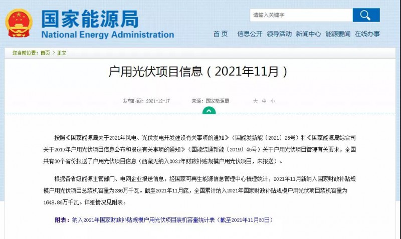 根據(jù)各省級(jí)能源主管部門、電網(wǎng)企業(yè)報(bào)送信息,經(jīng)國家可再生能源信息管理中心梳理統(tǒng)計(jì),2021年11月新納入國家財(cái)政補(bǔ)貼規(guī)模戶用光伏項(xiàng)目總裝機(jī)容量為286萬千瓦。截至2021年11月底,全國累計(jì)納入2021年國家財(cái)政補(bǔ)貼規(guī)模戶用光伏項(xiàng)目裝機(jī)容量為1648.86萬千瓦。詳細(xì)情況見附表。