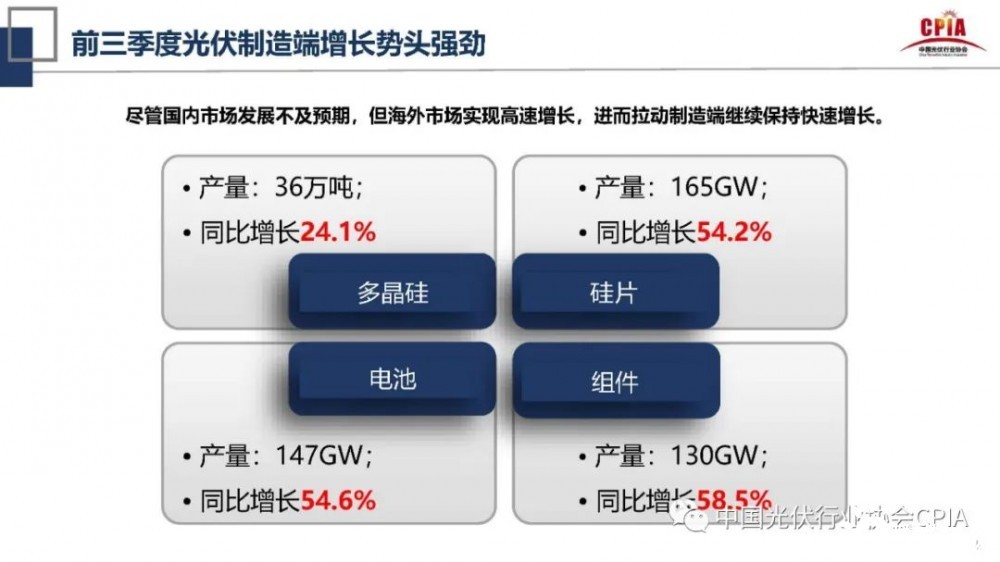 在此次會(huì)議上,王勃華對(duì)光伏行業(yè)的發(fā)展情況做了詳細(xì)介紹。在光伏制造端方面,他指出,2021年前三季度光伏制造端增長勢(shì)頭強(qiáng)勁,在光伏制造端四個(gè)環(huán)節(jié)中,多晶硅產(chǎn)量為36萬噸,同比增長24.1%;硅片產(chǎn)量為165GW,同比增長54.2%;電池產(chǎn)量為147GW,同比增長54.6%;組件產(chǎn)量為130GW,同比增長58.5%。他表示,盡管國內(nèi)市場(chǎng)發(fā)展不及預(yù)期,但海外市場(chǎng)實(shí)現(xiàn)了高速增長,進(jìn)而拉動(dòng)光伏制造端繼續(xù)保持快速增長。因此,光伏制造端在今年仍處于快速發(fā)展中。