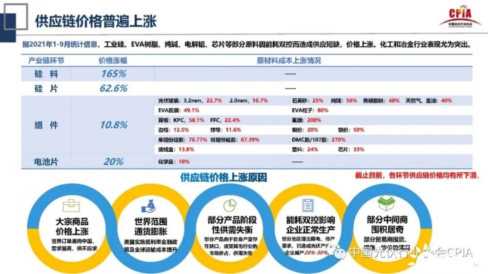據(jù)此,王勃華表示,供應(yīng)鏈價(jià)格的上漲尤其會(huì)影響到光伏裝機(jī)的預(yù)測(cè)。他說:“今年光伏裝機(jī)量預(yù)測(cè)要下調(diào),由原來的55-65GW下調(diào)至45-55GW,發(fā)展不及預(yù)期的原因?yàn)橹笜?biāo)下發(fā)滯后、價(jià)格上漲等所致。但是2022年光伏裝機(jī)在國內(nèi)巨大的光伏發(fā)電項(xiàng)目儲(chǔ)備量推動(dòng)下,可能會(huì)增至75GW以上。”