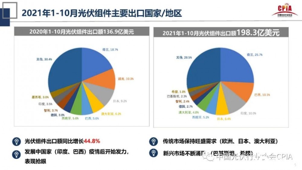 緊接著,王勃華對(duì)2020年和2021年光伏組件主要出口國家/地區(qū)做了介紹。2021年1-10月光伏組件出口額為198.3億美元,其中,歐洲、日本、澳大利亞等傳統(tǒng)市場(chǎng)國家保持旺盛需求,巴基斯坦、希臘等新興市場(chǎng)也不斷涌現(xiàn)出來。對(duì)比2020年,2020年1-10月光伏組件出口額為136.9億美元,同比增長44.8%,其中,印度、巴西等發(fā)展中國家在疫情后開始發(fā)力,表現(xiàn)十分搶眼。
