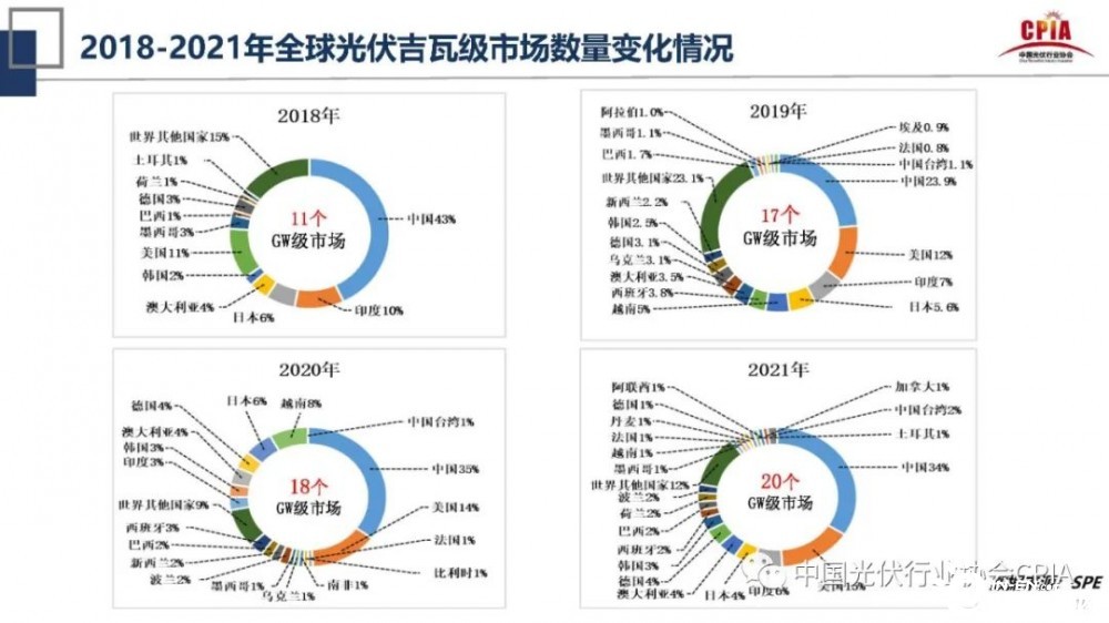 王勃華還指出,根據(jù)統(tǒng)計(jì),2018年-2021年全球光伏吉瓦級(jí)市場(chǎng)數(shù)量達(dá)20個(gè),根據(jù)預(yù)測(cè),2022年將達(dá)到26個(gè)。王勃華表示,光伏吉瓦級(jí)市場(chǎng)的增加,增強(qiáng)了我們?cè)趪H貿(mào)易中抗沖擊能力和抗打擊能力。