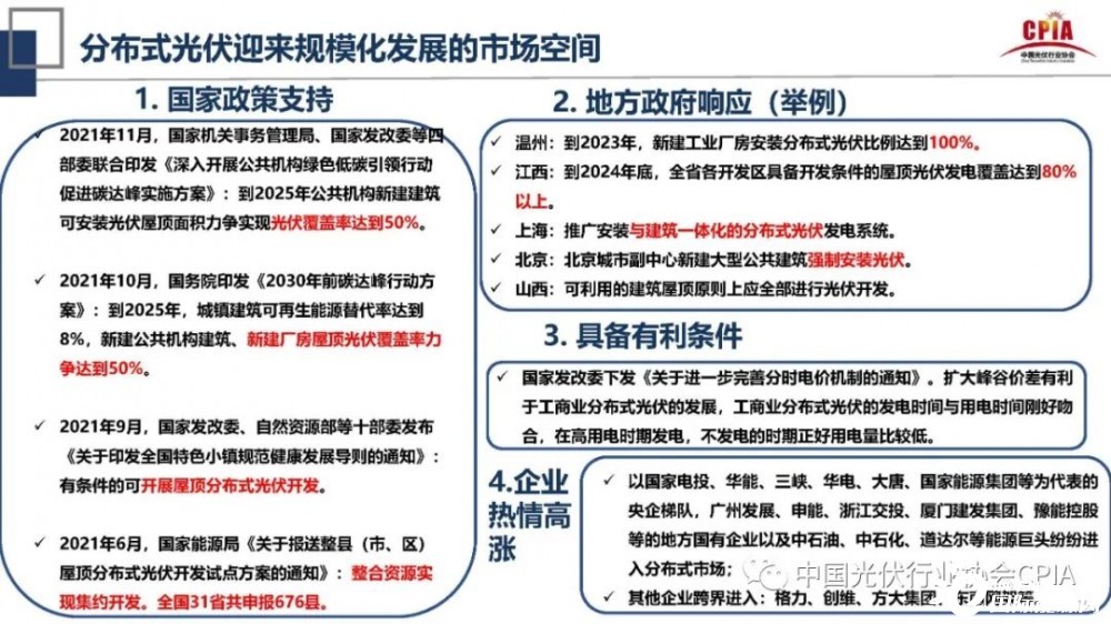 王勃華還指出,未來分布式光伏將迎來規(guī)模化發(fā)展的市場(chǎng)空間。究其原因是,第一,國家、地方政策的支持,以央企為梯隊(duì),地方國有企業(yè)和跨界能源巨頭企業(yè)為代表紛紛進(jìn)入分布式市場(chǎng)。第二,光伏盈利模式、商業(yè)模式的多元化。盈利上光伏電站收益新增綠電交易和碳交易(CCER)等盈利模式,商業(yè)模式方面是綜合能源服務(wù)和光伏與電動(dòng)汽車融合發(fā)展。
