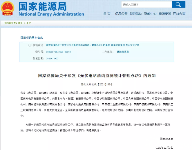 12月20日,國(guó)家能源局發(fā)布關(guān)于印發(fā)《光伏電站消納監(jiān)測(cè)統(tǒng)計(jì)管理辦法》的通知。