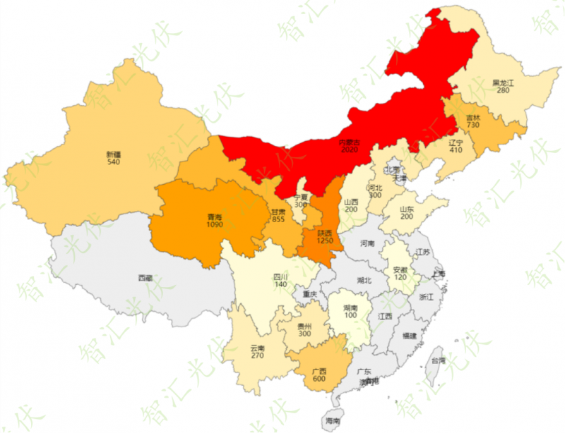 2021年11月24日,國(guó)家能源局、國(guó)家發(fā)改委印發(fā)的《第一批以沙漠、戈壁、荒漠地區(qū)為重點(diǎn)的大型風(fēng)電、光伏基地建設(shè)項(xiàng)目清單的通知》,涉及19省份,規(guī)??傆?jì)97.05GW。各省具體的規(guī)模如下圖所示。