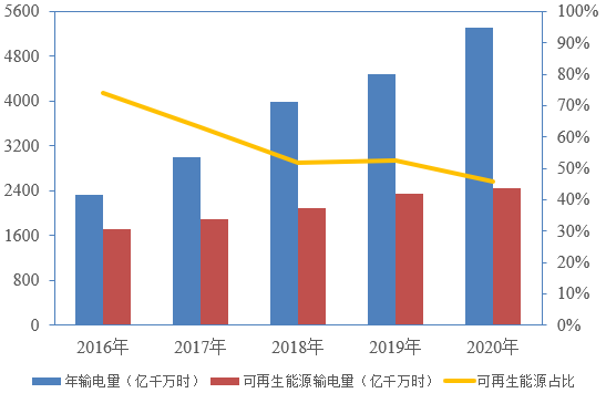 “十三五”期間,我國特高壓工程建設(shè)進(jìn)展迅速,特高壓線路輸送電量和輸送可再生能源電量逐年增加,“西電東送”工程穩(wěn)步向前,但輸送可再生能源電量的比重反而在下降,2020年我國22條特高壓輸送通道平均可再生能源占比為46%,創(chuàng)下近五年新低。2021年10月24日,國務(wù)院印發(fā)的《2030年前碳達(dá)峰行動(dòng)方案》提出“嚴(yán)控跨區(qū)外送可再生能源電力配套煤電規(guī)模,新建通道可再生能源電量比例原則上不低于50%。”可以預(yù)見,隨著全社會(huì)對碳達(dá)峰、碳中和目標(biāo)形成共識以及國家政策引導(dǎo),清潔能源占比將持續(xù)提升。