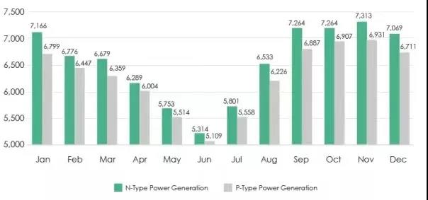 該項(xiàng)目位于澳大利亞?wèn)|北部昆士蘭州,具有亞熱帶季風(fēng)氣候特性,全年分干濕兩季。該研究目的是對(duì)比163尺寸60片N型和P型組件發(fā)電增益的不同,其中項(xiàng)目總?cè)萘渴?.5MW,逆變器型號(hào)為古瑞瓦特80kW,所有組件都在白漆鋼結(jié)構(gòu)屋頂上方1米以上位置安裝,傾斜角度15度。上表顯示了2020年1月至2020年12月兩種組件的發(fā)電量:與P型雙面組件相比,N型雙面組件單瓦和背面發(fā)電量顯著提升,整體發(fā)電量增加了5%。