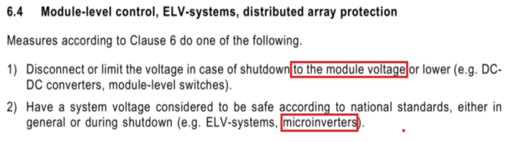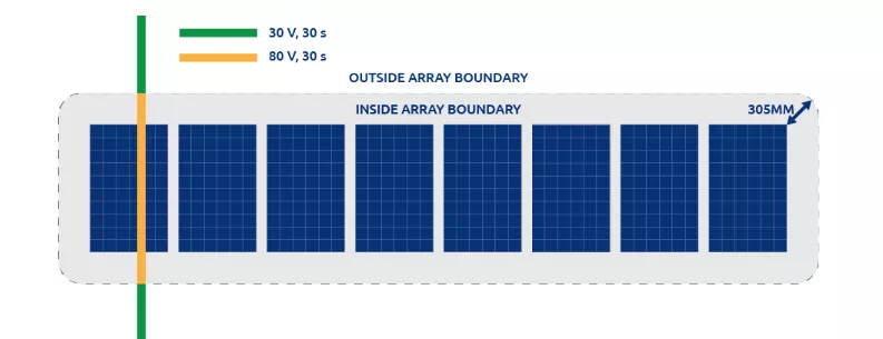 規(guī)范每三年更新一次,在全美范圍內(nèi)有效,但不同的州可執(zhí)行不同版本的規(guī)范。在最新版的NEC2020文件中要求:以距離到光伏矩陣305mm為界限,界限范圍外,在觸發(fā)設(shè)備啟動后30S內(nèi),電壓降低到30V以下,界線范圍內(nèi),要求具有“光伏危險(xiǎn)控制系統(tǒng)”,或在觸發(fā)設(shè)備啟動后30S內(nèi),將電壓降低到80V以下,也就是要求實(shí)現(xiàn)“組件級關(guān)斷”。