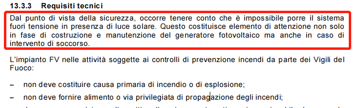 意大利標(biāo)準(zhǔn) CEI 82-25標(biāo)準(zhǔn)明確指出:“從安全的角度來看,必須考慮到在有陽光的情況下無法安全關(guān)閉光伏系統(tǒng)的情況。這不僅是光伏發(fā)電系統(tǒng)的建造和維護(hù)階段的一個注意事項(xiàng),而且在緊急干預(yù)的情況下也是如此。”