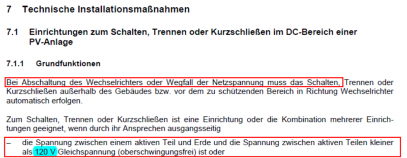 根據(jù)德國標(biāo)準(zhǔn) VDE-AR-E 2100-712要求:在光伏系統(tǒng)中如果逆變器關(guān)閉或者電網(wǎng)出現(xiàn)故障時,需要使直流電壓小于120V。其中,提到了可以使用關(guān)斷裝置使直流側(cè)電壓降至120V以下。
