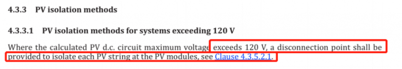 根據(jù)最新AS/NZS 5033:2021標(biāo)準(zhǔn)的4.3.3章節(jié)提到:當(dāng)直流電壓大于120Vd.c時,組件和逆變器之間需要安裝斷開裝置。
