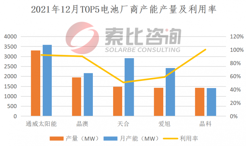 2021年12月,電池企業(yè)產(chǎn)量基本與上月持平,總產(chǎn)量為17.83GW,環(huán)比增加0.22%。按照產(chǎn)量排名,通威、晶澳、天合、愛旭、晶科位列前五,企業(yè)總產(chǎn)量9.57GW,占比53.67%,綜合利用率78.37%。垂直一體化企業(yè)綜合利用率率70.6%,主流電池企業(yè)綜合利用率81.36%。