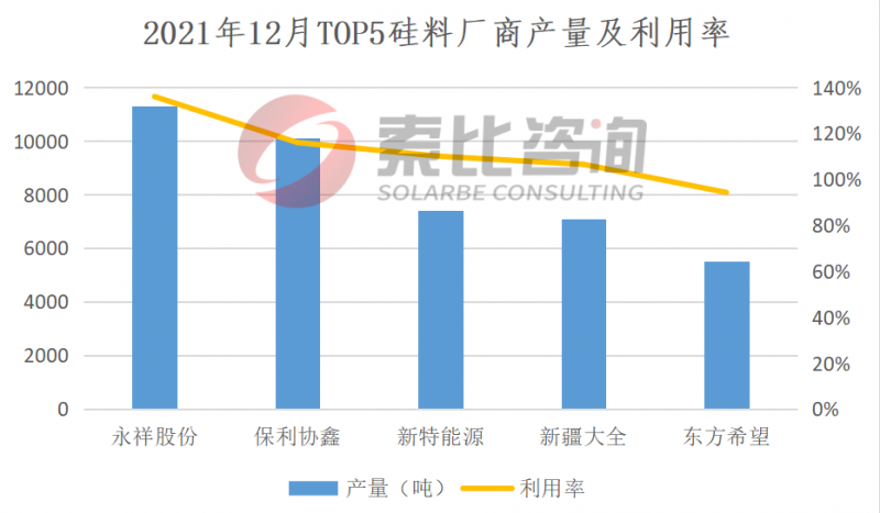 2021年12月,國內(nèi)12家多晶硅企業(yè)在產(chǎn),兩家企業(yè)擴(kuò)產(chǎn)量逐步釋放,產(chǎn)量再創(chuàng)新高。連續(xù)兩周成交清淡,導(dǎo)致部分硅料企業(yè)有少量庫存積壓。12月份國內(nèi)多晶硅產(chǎn)量為4.88萬噸(約19.28GW),環(huán)比增長15.9%。按照產(chǎn)量排名,永祥、協(xié)鑫、新特、大全、東方希望位列前五,企業(yè)總產(chǎn)量4.14萬噸,占比84.8%,綜合利用率112.6%。索比咨詢預(yù)期1月份硅料產(chǎn)量小幅上漲。從供應(yīng)端來看,12月份協(xié)鑫顆粒硅及新疆大全擴(kuò)產(chǎn)產(chǎn)能有少量釋放。從需求端來看,終端采購力度有所回暖,開工率上升。