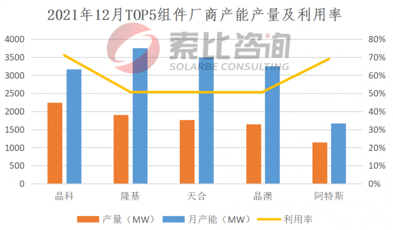 2021年12月,終端需求小幅上升,因此本月組件產(chǎn)量比上月也有小幅上漲。國內(nèi)組件產(chǎn)量16GW,環(huán)比增長2.23%。按照產(chǎn)量排名,晶科、隆基、天合、晶澳、阿特斯位列前五,企業(yè)總產(chǎn)量8.72GW,占比54.5%,綜合開工率58.41%。預(yù)計(jì)2022年1月,終端需求持續(xù)回暖,國內(nèi)2022年各企業(yè)集采招標(biāo)已陸續(xù)啟動(dòng),組件需求及價(jià)格都將小幅上漲。