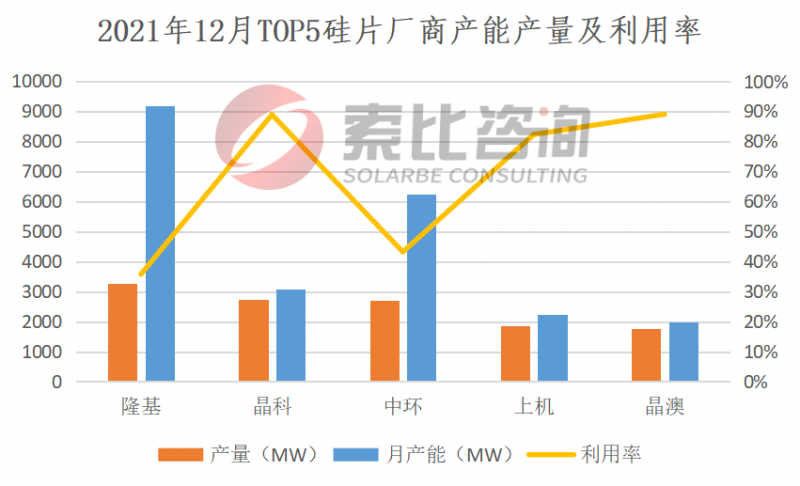 2021年12月,兩家頭部硅片企業(yè)開工率上升至50%和60%,但終端需求不及預(yù)期。2021年12月國內(nèi)硅片產(chǎn)量17.85GW,環(huán)比下降8.6%。按照產(chǎn)量排名,隆基、晶科、中環(huán)、上機(jī)、晶澳位列前五,企業(yè)總產(chǎn)量12.35GW,占比69.19%,綜合利用率67.81%。預(yù)計(jì)12月份硅片產(chǎn)量將有小幅回升。從供應(yīng)端來看,2022年1月份硅料產(chǎn)量將小幅上漲,硅片也有新產(chǎn)能投產(chǎn)。從需求端來看,終端需求預(yù)期將出現(xiàn)小幅提升。