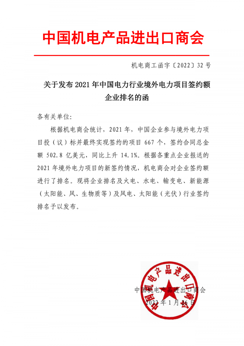1月26日,中國機電產品進出口商會發(fā)布中國企業(yè)參與境外電力項目投(議)標并最終實現(xiàn)簽約的項目667個,簽約合同總金額502.8億美元,同比上升14.1%。并對火電、水電、輸變電、新能源(太陽能、風、生物質等)及風電、太陽能(光伏)行業(yè)簽約額進行了排名。