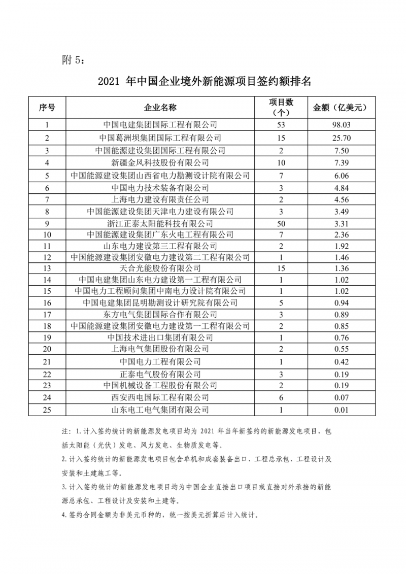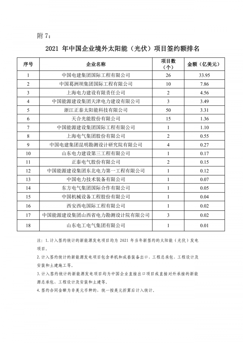 據(jù)了解,計入簽約統(tǒng)計的新能源發(fā)電項目包含單機和成套裝備出口、工程總承包、工程設計及安裝和土建施工等;新能源發(fā)電項目均為中國企業(yè)直接出口項目或直接對外承接的新能源總承包、工程設計及安裝和土建等。