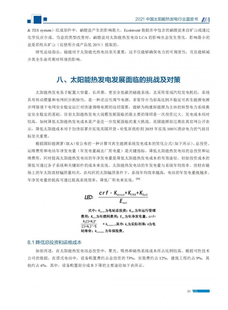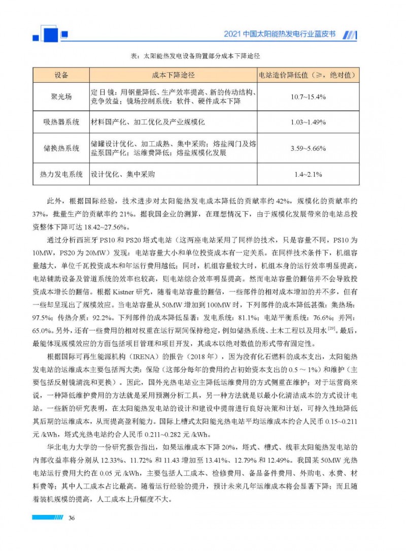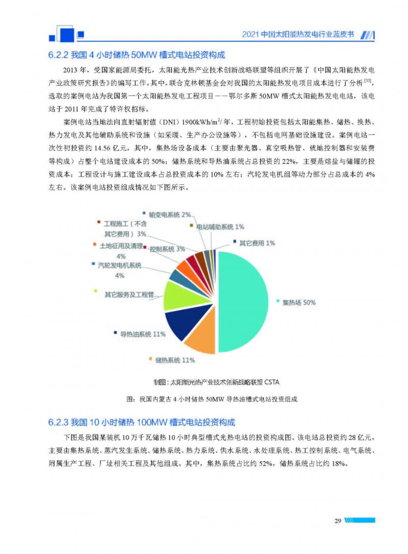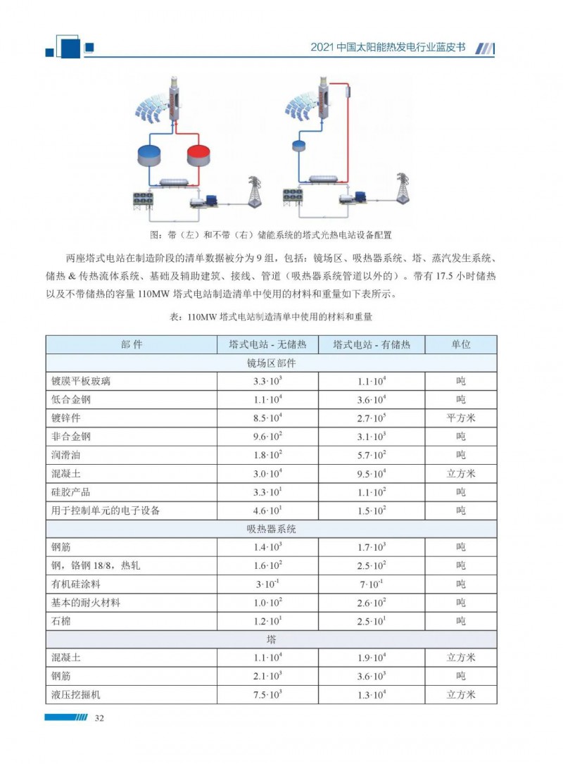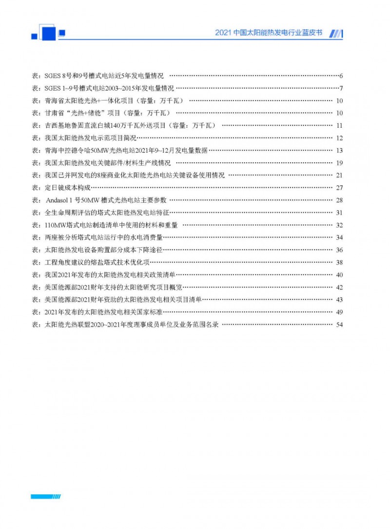 2021中國太陽能熱發(fā)電行業(yè)藍(lán)皮書(以下簡(jiǎn)稱“藍(lán)皮書”)共分為9個(gè)章節(jié),分別為:太陽能熱發(fā)電的發(fā)展機(jī)遇和定位、太陽能熱發(fā)電市場(chǎng)發(fā)展、我國太陽能熱發(fā)電示范項(xiàng)目運(yùn)行情況、我國太陽能熱發(fā)電產(chǎn)業(yè)鏈情況、我國太陽能熱發(fā)電研發(fā)項(xiàng)目情況、太陽能熱發(fā)電投資成本、太陽能熱發(fā)電站全生命周期碳排放、太陽能熱發(fā)電發(fā)展面臨的挑戰(zhàn)及對(duì)策,以及附錄。附錄主要包括:我國2021年發(fā)布的太陽能熱發(fā)電項(xiàng)目政策、美國能源部2021年度支持的太陽能熱發(fā)電項(xiàng)目清單、2021年發(fā)布的太陽能熱發(fā)電相關(guān)國家標(biāo)準(zhǔn)、我國太陽能熱發(fā)電行業(yè)發(fā)展主要?dú)v程、太陽能光熱聯(lián)盟理事成員單位及業(yè)務(wù)范圍名錄。全文4.5萬+字,共55張圖表。