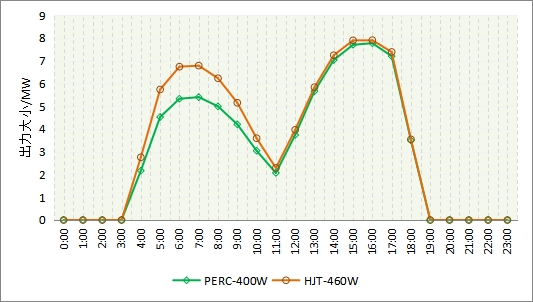 由于組件正面朝西,背面朝東,上午時(shí)刻,組件背面接收輻射,由于異質(zhì)結(jié)組件的雙面率較高,因此總體出力大小高于PERC組件。到了下午,太陽(yáng)照射在組件的正面,雖然背面的輻射接收量較小,但是異質(zhì)結(jié)組件的出力大小仍略高于PERC組件。
