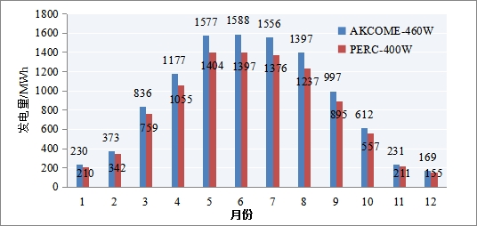 根據(jù)模擬結(jié)果,PERC400W組件及異質(zhì)結(jié)460W雙面組件的首年月份發(fā)電對(duì)比結(jié)果如圖2所示,在3月至9月,異質(zhì)結(jié)組件的發(fā)電提升較為明顯,而在10月至次年2月,差異較小。