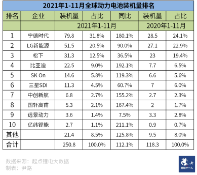 圖3:2021年1-11月全球動(dòng)力電池裝機(jī)量排名