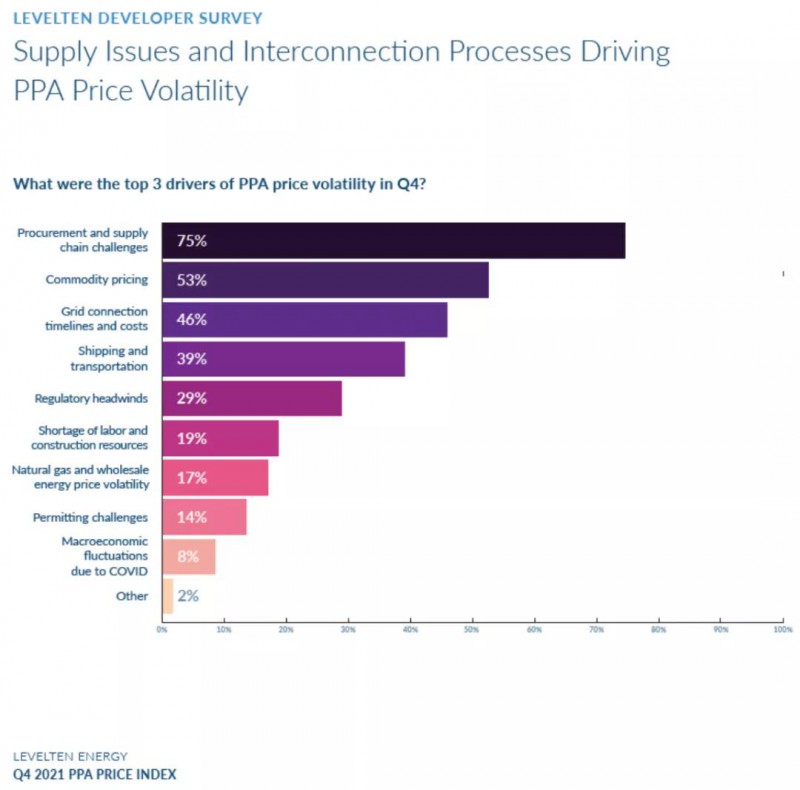 上述創(chuàng)紀錄的太陽能光伏的采購是在光伏成本上升的情況下發(fā)生的。LevelTen Energy的一項調(diào)查表明,由于需求增加、宏觀經(jīng)濟波動、供應鏈問題以及其他因素的影響,光伏成本從 2020 年初開始上漲。據(jù)LevelTen Energy 的最新報告, 2021 年第四季度購電協(xié)議( PPA) 價格指數(shù)顯示光伏價格上漲了 5.7%,達到34.25 美元/兆瓦時。