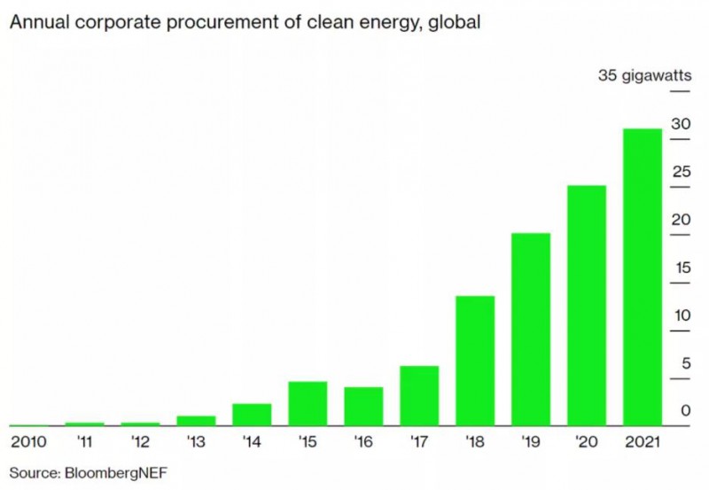 彭博新能源財經(jīng)報道,2021年有 67 家公司加入了 RE100(100%可再生能源倡議),總計有 355 家公司承諾使用 100% 可再生能源。2021年全球企業(yè)采購可再生能源合同的容量創(chuàng)下了 31GW 的新紀錄。其中大部分產(chǎn)能是在美洲采購的,其中 17GW 來自美國的企業(yè),3.3GW 來自北美和南美的其他國家的企業(yè)。