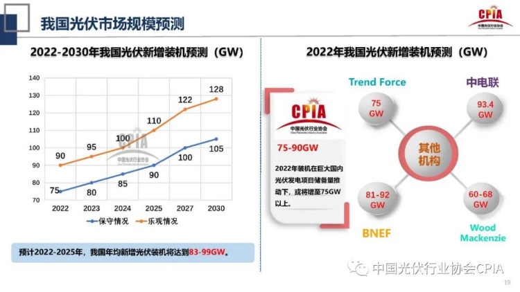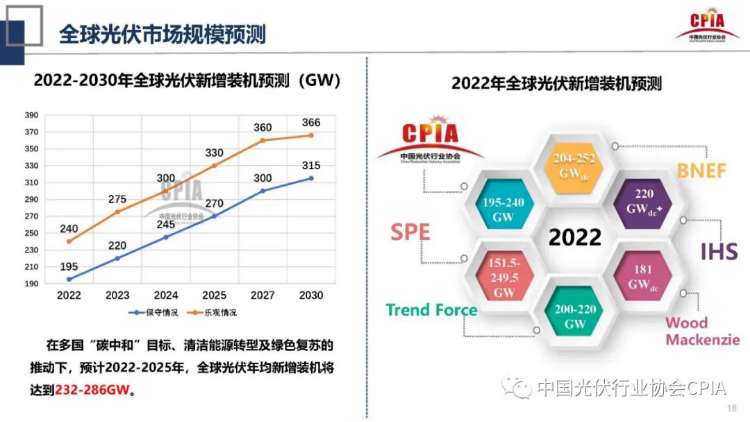 昨日由中國(guó)光伏行業(yè)協(xié)會(huì)組織召開(kāi)的2021年發(fā)展回顧與2022年形勢(shì)展望線上研討會(huì)上,名譽(yù)理事長(zhǎng)王勃華在報(bào)告中對(duì)于2022年光伏市場(chǎng)前景給出樂(lè)觀預(yù)期,多家機(jī)構(gòu)也給出國(guó)內(nèi)新增裝機(jī)75GW以上、全球新增200GW以上的預(yù)測(cè)。考慮到光伏電站項(xiàng)目的“組件-逆變器容配比”普遍大于1,全年對(duì)光伏組件的需求很可能在250GW以上,其中晶硅組件不少于230GW。