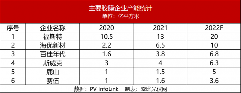 索比光伏網(wǎng)注意到,自 2021年至今,膠膜龍頭企業(yè)陸續(xù)發(fā)布多則擴(kuò)產(chǎn)、投產(chǎn)信息。以百佳年代為例,越南基地一期4GW項(xiàng)目、咸陽(yáng)基地8GW項(xiàng)目、鹽城基地二期20GW項(xiàng)目以及1月份簽約的滁州基地20GW項(xiàng)目相繼建設(shè)投產(chǎn)。內(nèi)部相關(guān)人士透露,“百佳年代越南基地二期項(xiàng)目正在建設(shè)階段,投產(chǎn)后越南基地產(chǎn)能將達(dá)到16GW,總規(guī)劃產(chǎn)能達(dá)到近100GW。”不久前福斯特、海優(yōu)新材等也表示,其膠膜產(chǎn)能將有數(shù)億平方米規(guī)模的提升,為光伏行業(yè)的快速發(fā)展提前做好準(zhǔn)備。