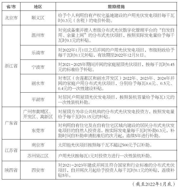 2022年新建項(xiàng)目國家補(bǔ)貼政策還未明確,戶用光伏平價(jià)上網(wǎng)已被業(yè)內(nèi)認(rèn)為是大勢(shì)所趨。據(jù)不完全統(tǒng)計(jì),截至2022年1月底,已有北京、浙江、江蘇等省(市)的二十多個(gè)地區(qū)提出了分布式光伏新增項(xiàng)目電價(jià)補(bǔ)貼、補(bǔ)助或獎(jiǎng)勵(lì)政策,部分地區(qū)還為戶用光伏項(xiàng)目設(shè)置了專項(xiàng)補(bǔ)貼,以期吸引更多社會(huì)資本進(jìn)入當(dāng)?shù)貞粲霉夥袌?chǎng)。