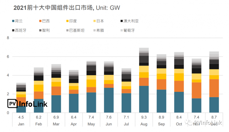 中國2021年出口了40.9GW的組件到歐洲市場,相較前一年的26.7GW同比成長了54%。受惠于能源轉(zhuǎn)型趨勢,歐洲持續(xù)維持最大的組件進口市場,全球占比46%。主要的國家包括了荷蘭、西班牙、希臘、葡萄牙、波蘭和德國,都達到了GW級以上的進口量,其中荷蘭為中國的第一大出口國,全年總量來到了23.8GW。但是在十一月時,受到了歐洲法院專利判決的影響,部分廠家無法銷售受影響產(chǎn)品,進口量快速下滑。