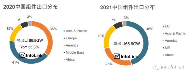 2021光伏產(chǎn)業(yè)面臨動蕩的一年,歷經(jīng)了多晶硅暴漲,以及中國的能耗管控政策,供應(yīng)鏈價格劇烈波動,但全球光伏裝機仍是繳出了優(yōu)異的成績。根據(jù)PV Infolink統(tǒng)計,2021年的全球光伏新增裝機容量達到172.6 GW,同比成長23.1%,其中,非中國市場的裝機量來到了124.6GW,同比成長了30.1%。海外需求的快速成長也帶動了中國光伏組件的出口,根據(jù)PV Infolink統(tǒng)計中國海關(guān)出口資料,中國在2021出口組件總量來到了88.8GW,同比增長了35.3%。主要的成長來源仍是歐洲、巴西和印度等主要光伏市場。