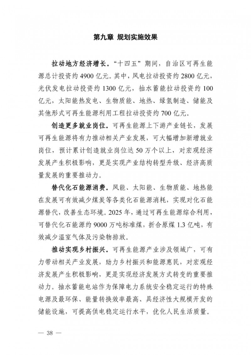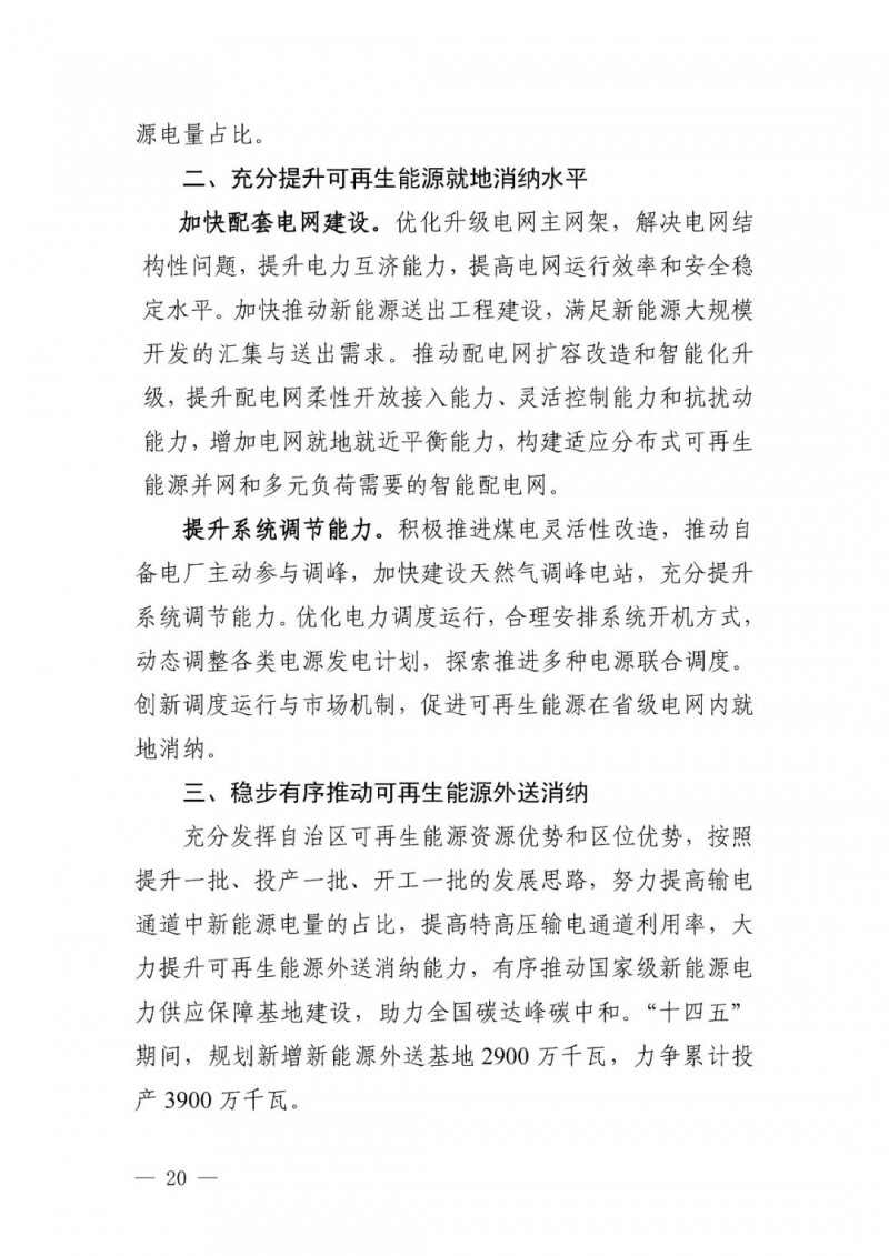 可再生能源發(fā)電目標(biāo)。自治區(qū)可再生能源發(fā)電裝機(jī)達(dá)到 1.35 億千瓦以上,其中風(fēng)電 8900 萬千瓦、光伏發(fā)電 4500 萬千瓦,新能源裝機(jī)規(guī)模超過燃煤火電裝機(jī)規(guī)模,新能源發(fā)電量占自治區(qū)總發(fā)電量比重超過35%。“十四五”期間可再生能源新增裝機(jī) 8000 萬千瓦以上,占全部新增裝機(jī)的比重超過 60%,成為新增裝機(jī)的主力。